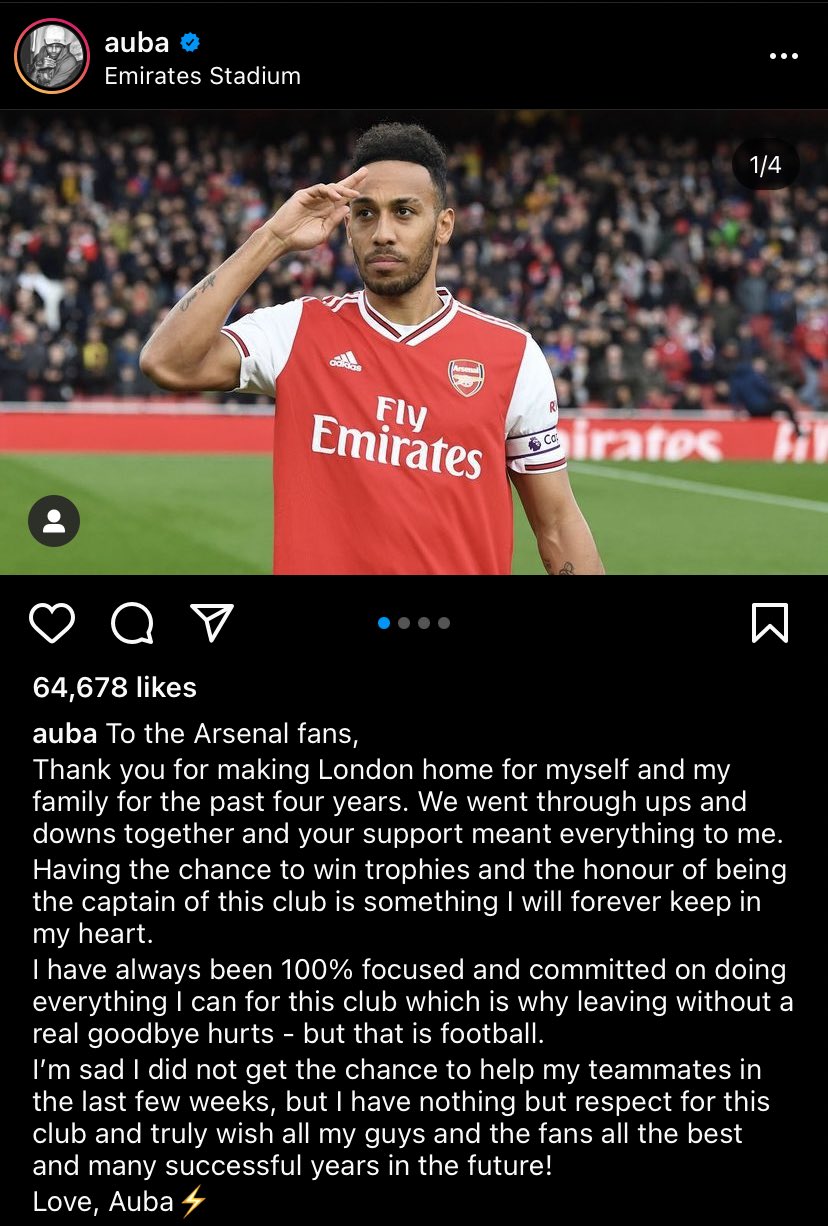 Chris Wheatley on X: “Aubameyang’s goodbye message to the Arsenal